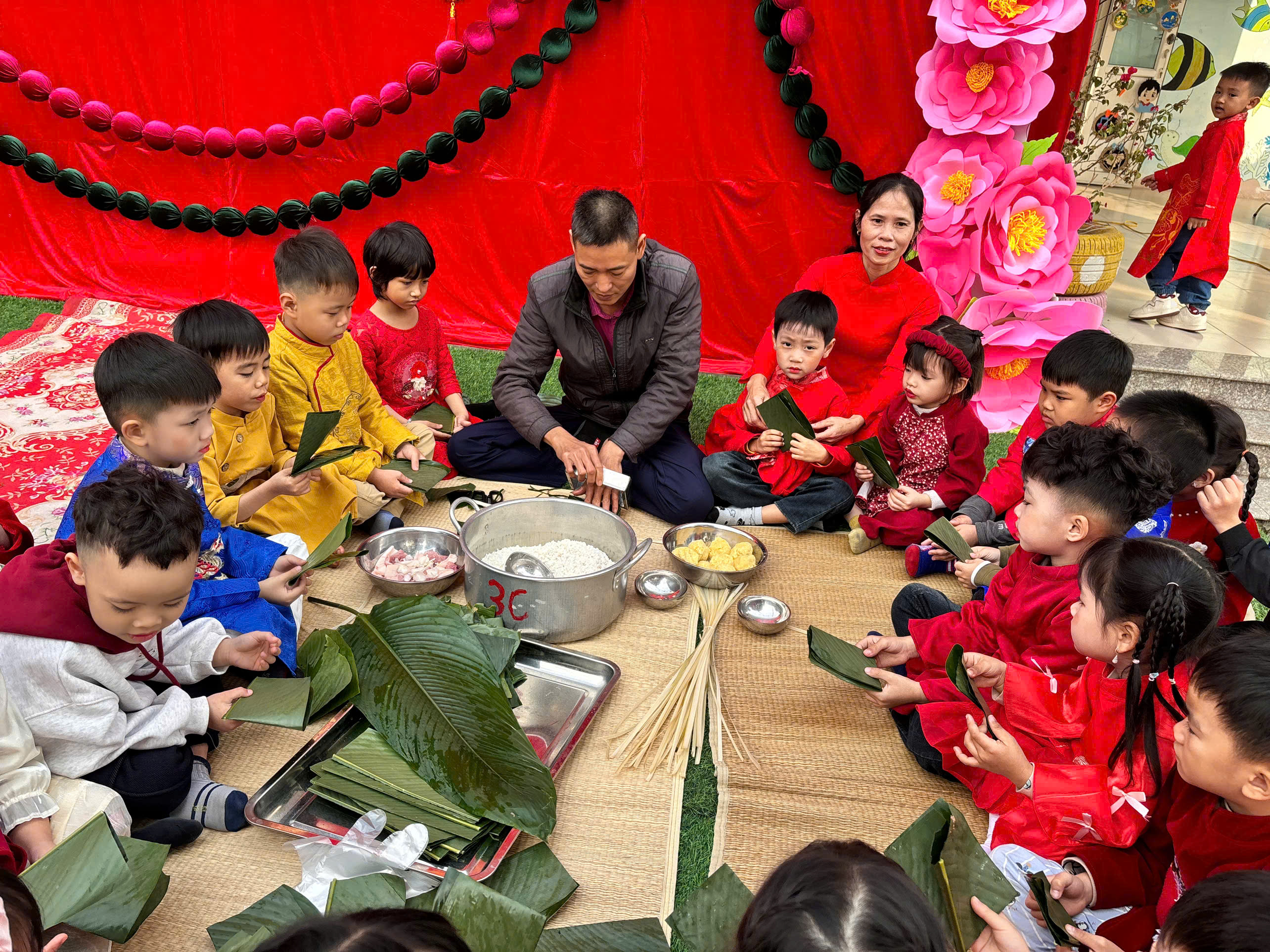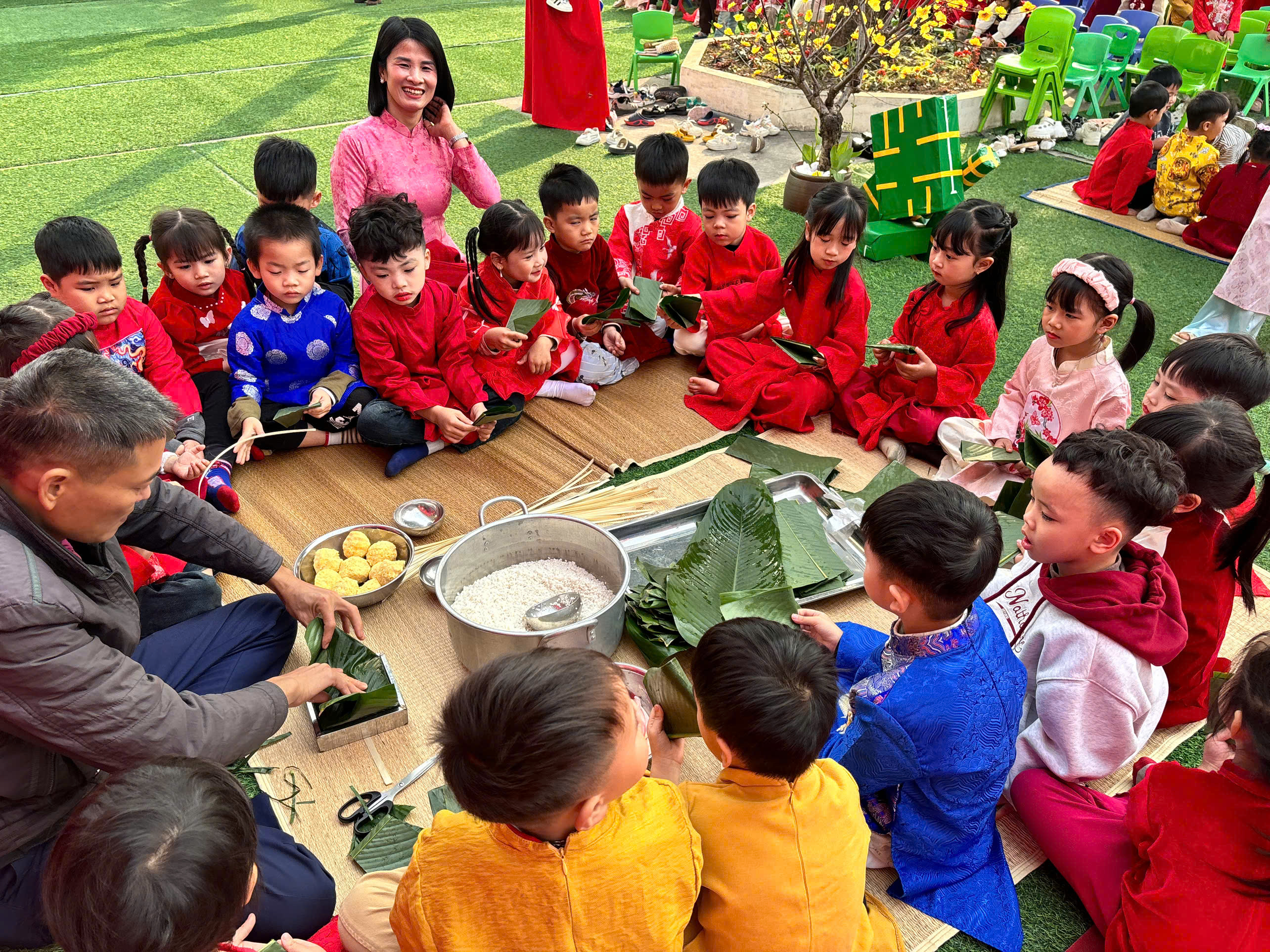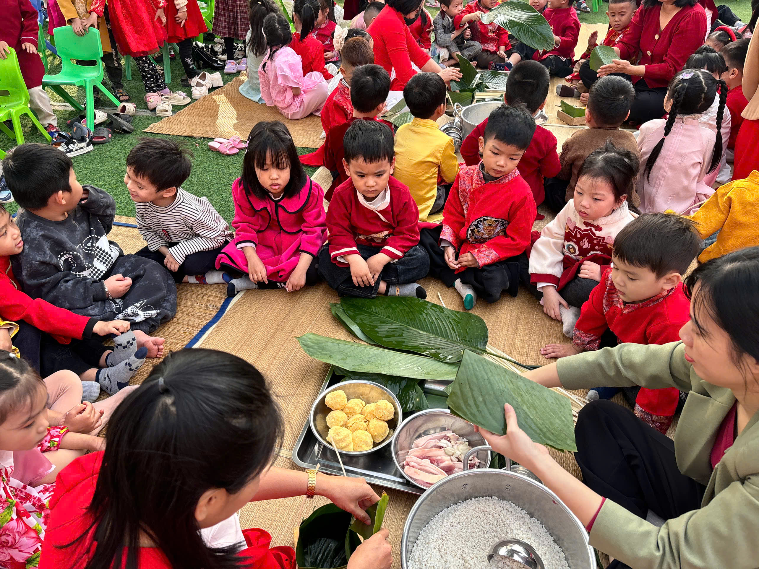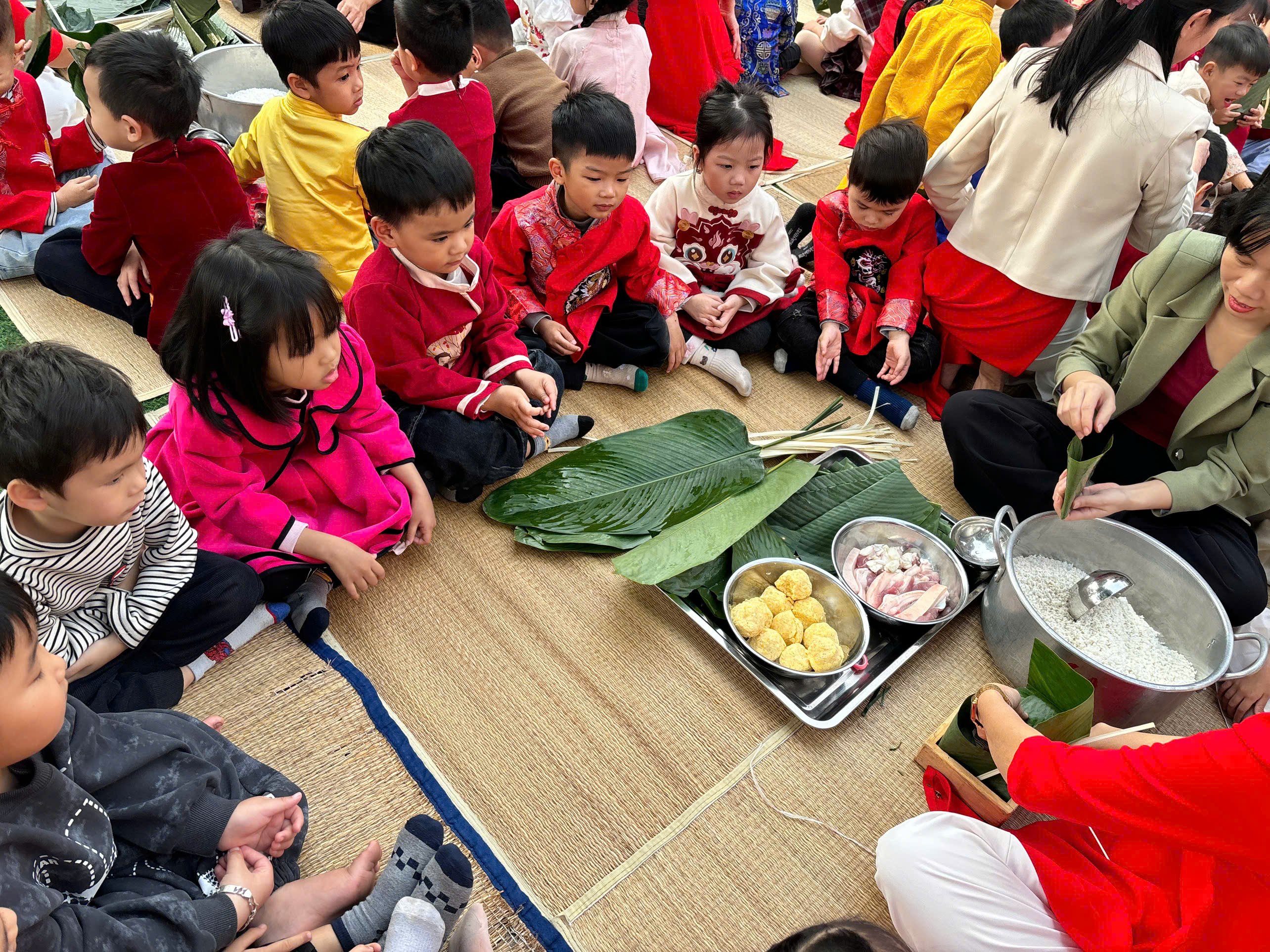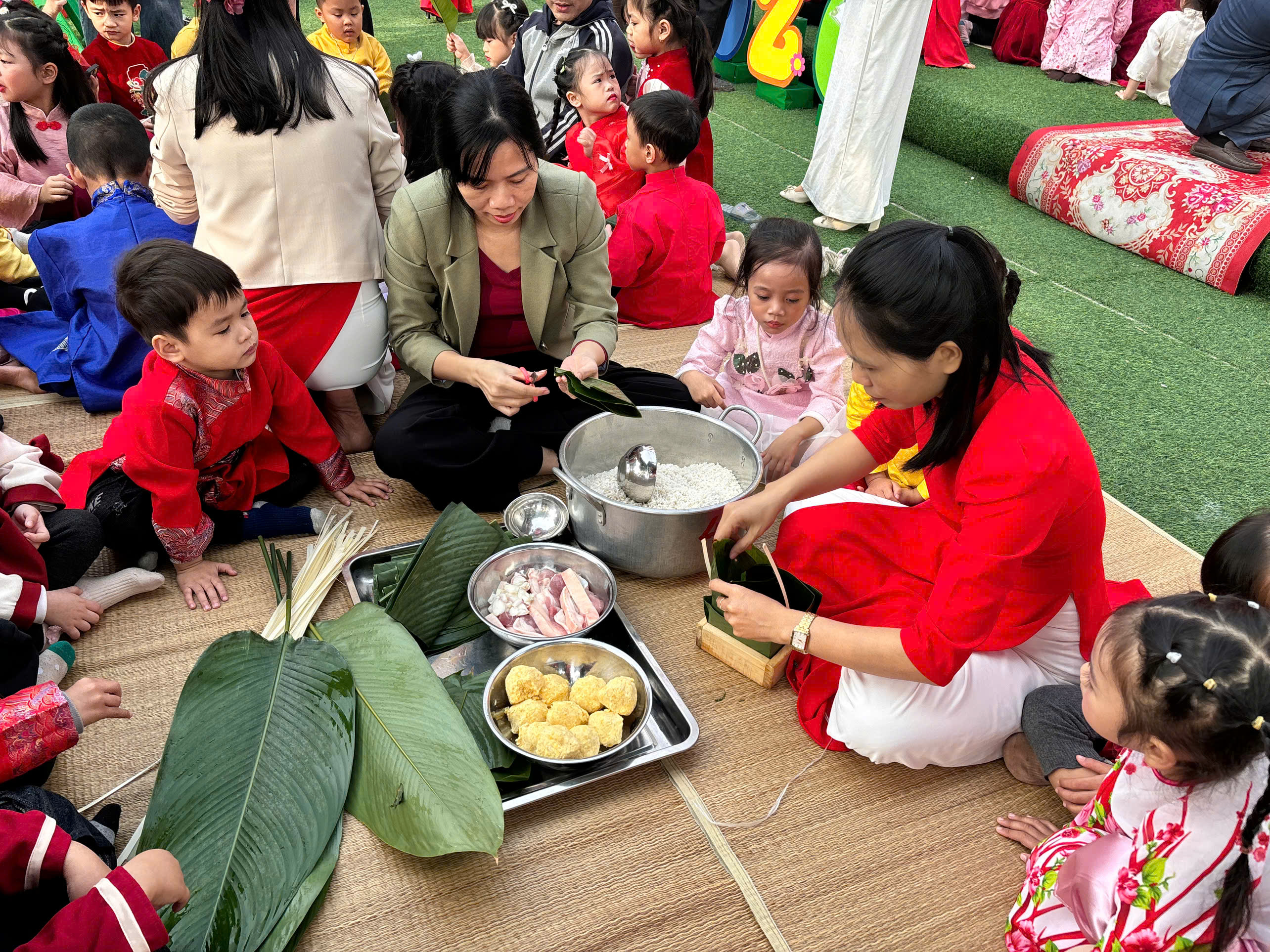 🥬 Đặc biệt, hoạt động trải nghiệm gói bánh chưng đã mang đến cho các bé một bài học sống động về Tết cổ truyền. Tự tay rửa lá, xếp khuôn, cho gạo, đỗ, thịt… các con không chỉ học cách làm bánh mà còn hiểu hơn về ý nghĩa sum vầy, trân trọng giá trị lao động và truyền thống “Uống nước nhớ nguồn”.
