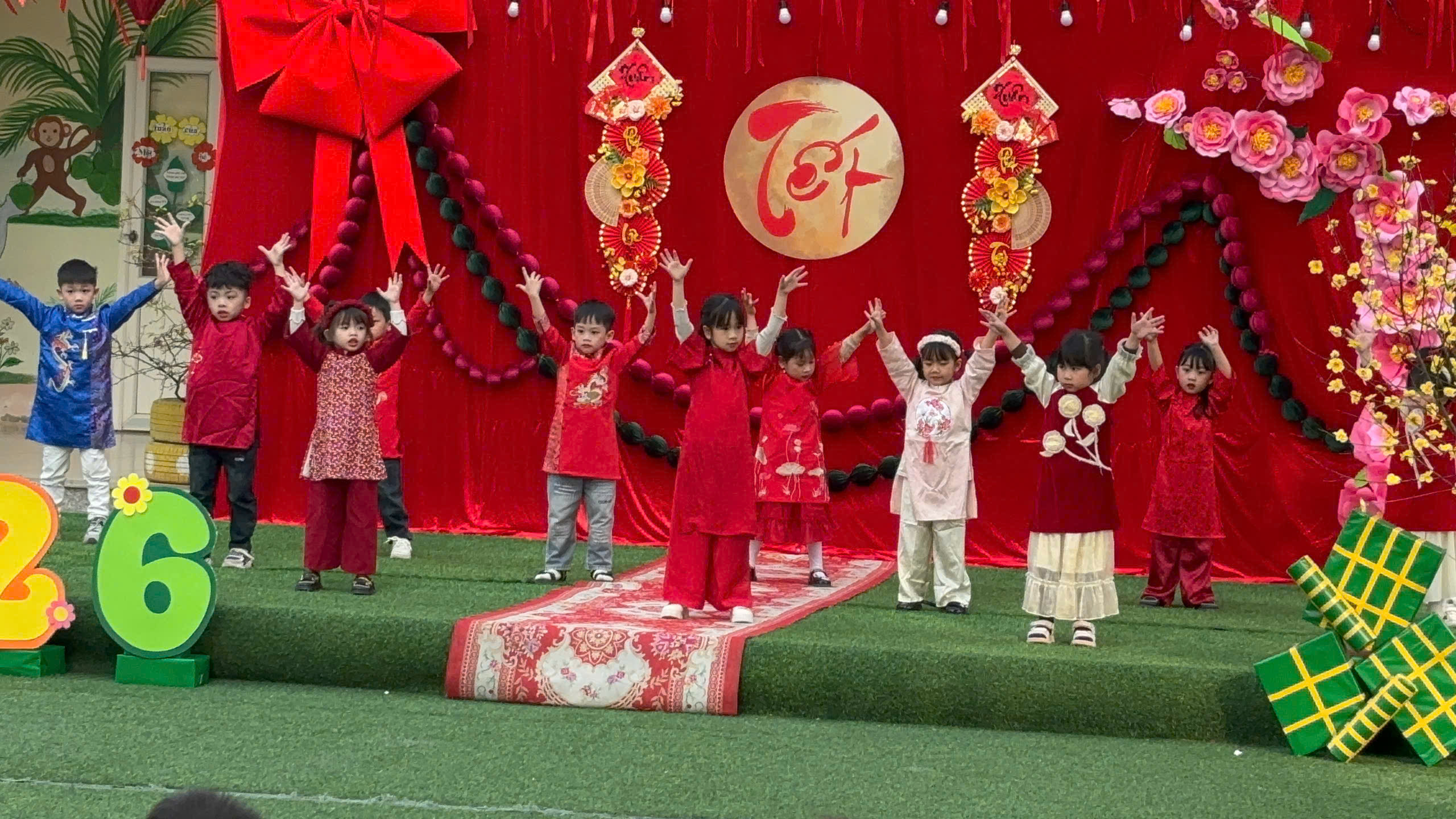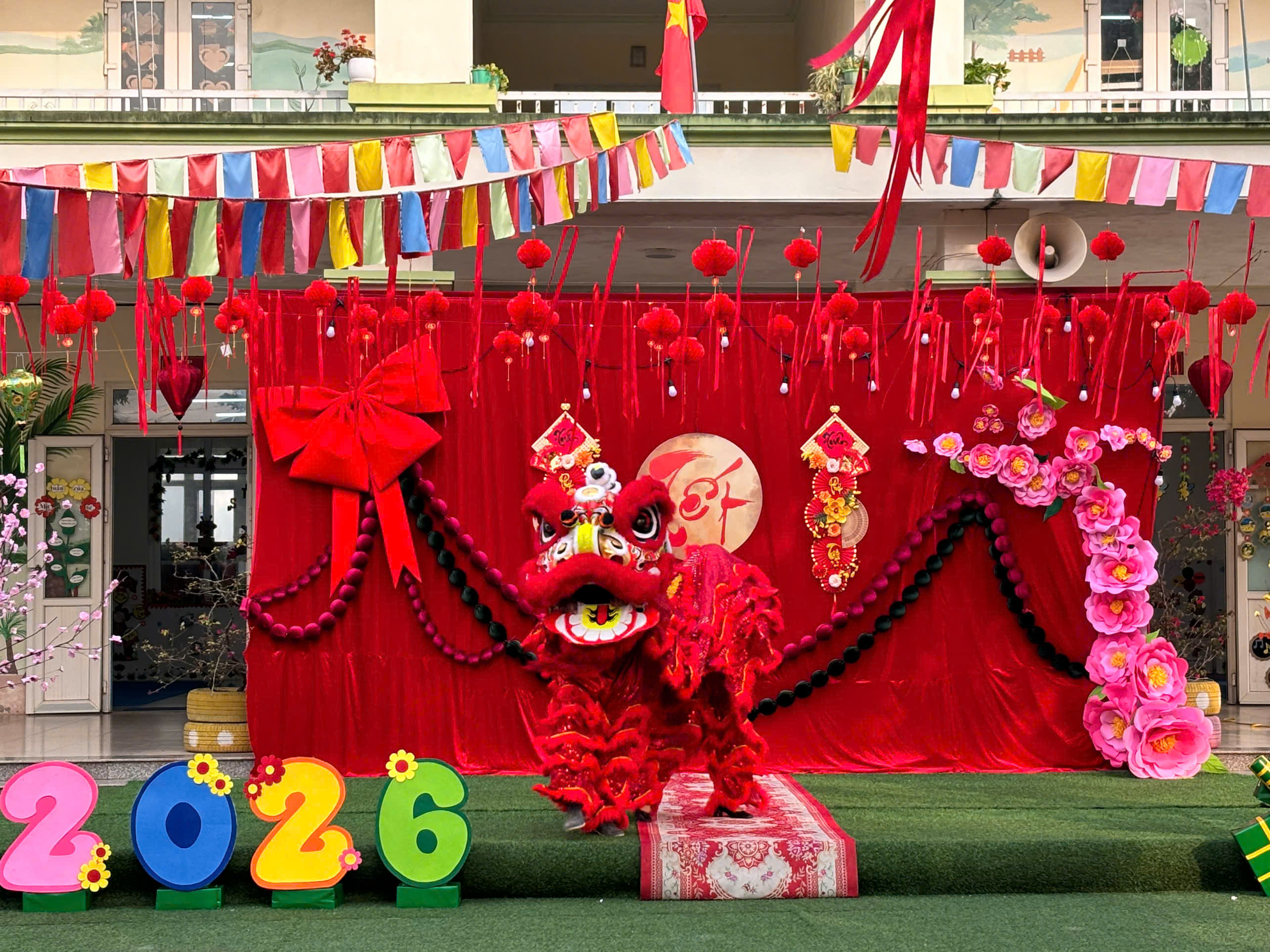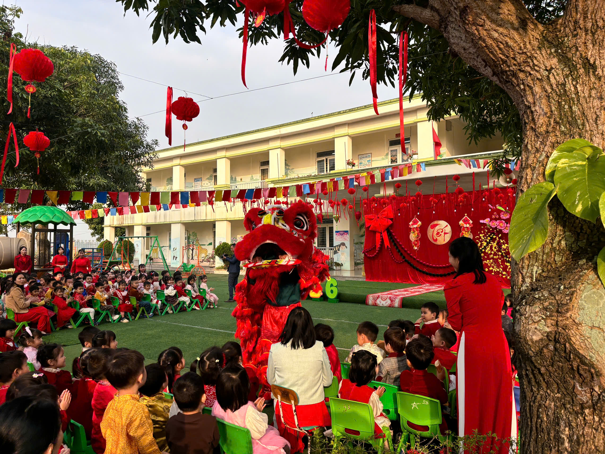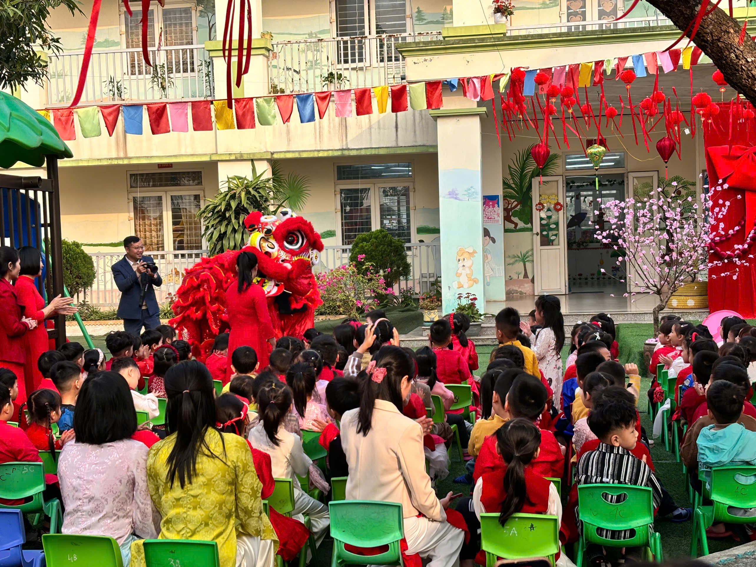 🎊 Mở đầu chương trình là màn múa lân rộn ràng, sôi động, mang theo lời chúc cho một năm mới an khang, may mắn. Tiếng trống vang lên cũng là lúc ánh mắt các con lấp lánh niềm vui, những bàn tay nhỏ xíu vỗ nhịp theo từng động tác, đánh thức trọn vẹn không khí Tết cổ truyền.